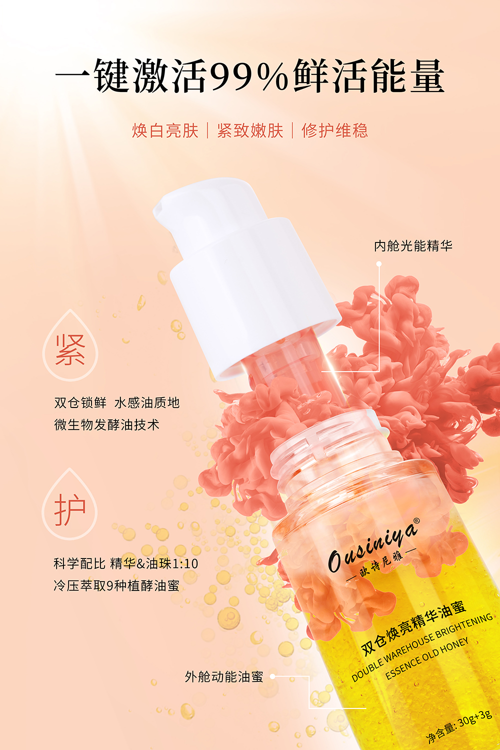 外御內(nèi)養(yǎng),構(gòu)建內(nèi)外雙倉(cāng)能量系統(tǒng):外艙「動(dòng)能油艙」復(fù)配九重東方植萃油脂,高效修護(hù),蘊(yùn)能抗衰;內(nèi)艙「光能蜜艙」搭載麥角硫因等雙抗精華,聚透水亮。雙艙獨(dú)立封存鮮活能量,通過(guò)微生物發(fā)酵油技術(shù),瞬間爆發(fā)生命能量,喚醒肌膚透亮光感肌。