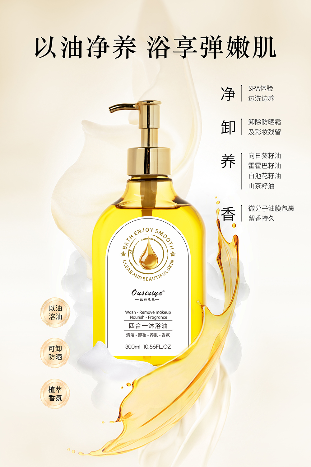 四合一沐浴油集清潔、卸妝、滋養(yǎng)與香氛于一身,在徹底清潔并修復(fù)肌膚屏障的同時,告別干燥緊繃。精選四重植物籽油精萃,深度滋養(yǎng)使肌膚柔滑水潤,煥發(fā)健康光澤。采用創(chuàng)新“以油溶油”技術(shù),溫和卸除身體防曬和素顏霜殘留,提供高效護理。微分子油膜包裹珍稀香氛,遇水釋放持久且層次豐富的香調(diào),讓沐浴后仿若自帶高級自然體香,為身心帶來愉悅的感官盛宴。
